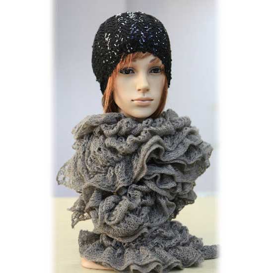 This elegant gray scarf is made from 100% acrylic lace. The versatile lace scarf can be worn in many different styles. The eye-catching scarf is perfect to accessorize your winter look.