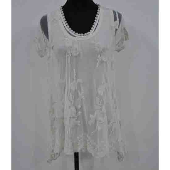 The ladies’ top here comes with a two-piece style. The inner layer is a tank top in pure white. The outer layer is a short-sleeved see-through top adorned with delicate lace and trimmings.