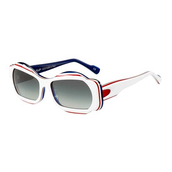 This pair of ladies’ sunglasses sports a bright white frame with navy blue and scarlet red details, evoking a sense of vogue. The gradient gray lenses make perfect harmony with irregular-shaped rims. These fun shades are sure to help you make a bold fashion statement.