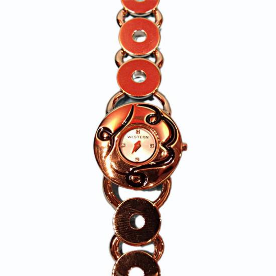 This sophisticated watch features a rose-gold stainless steel case. It boasts a unique chain-like watch band with circular-shaped details. The round dial comes with dazzling Swarovski-crystal hour markers. This elegant ladies' watch is perfect for grand occasions.