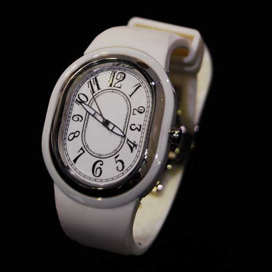 Showcased is a ladies' analog watch with a modern design. The dial comes in an arch shape with an Arabic-numeral display. Made of ceramic and rubber, the watch is nicely brushed to shine in a clean white complexion. This ladies' analog watch matches youthful outfits.