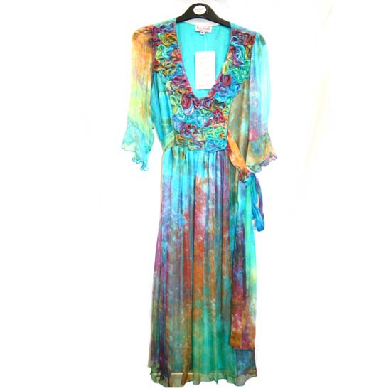 Put on this colorful long dress for a pleasing beach look. This dress comes with a loose-fit design and a deep V-neckline to match with swimsuits. The smooth silk fabric is printed in mixed colors.