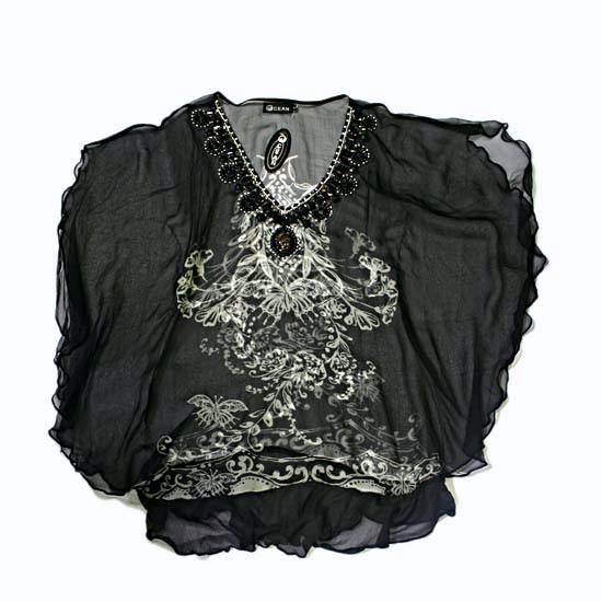This blouse has delicate printed patterns at the front to match with the see-through chiffon layers. The shiny beaded chain around the neck adds an extra sense of elegance to the blouse. This stylish blouse provides easy mix and match for different occasions.