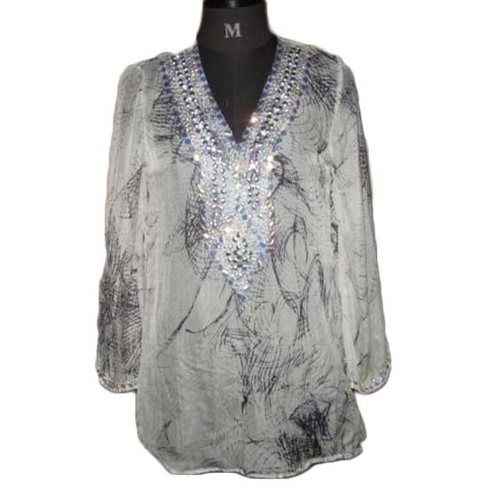 As shown is a ladies’ top coming with a loose-fit bodice and a pair of long puffed sleeves. The top features random streaks with a silky touch. The neckline with sparkling beads shows a fabulous design.