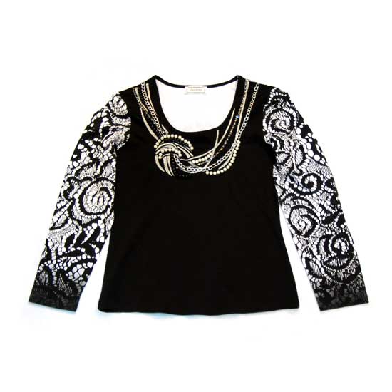 The ladies' top comes with a scoop neckline and long sleeves. The sleeves features filigree patterns with sequins and the collar is adorned with beaded accents. Put on this top with spray-on pants and heels.