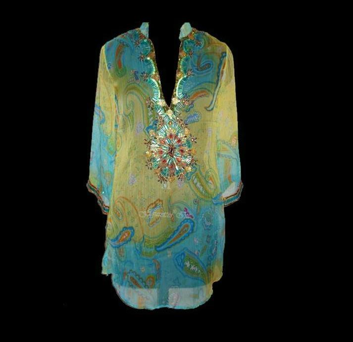 This blouse boasts an exotic style with various printed patterns. Its neck and cuffs are decorated with glittering beads. The chiffon material makes it very light and soft.
