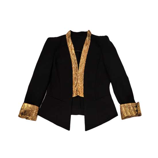 This elegant ladies' blazer in black is an essential item for a stylish ensemble. The gold lapels and cuffs contrast against the black for a stunning effect. The flattering cut of the jacket looks great on most body types.