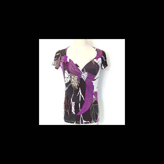 The blouse is designed with patterns in black, white, purple and brown colors