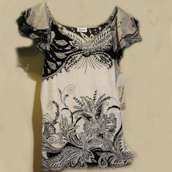 This stylish V-neck top features double-tiered cap sleeves. It has black and white floral patterns throughout. The hand-embroidered sequins add a hint of uniqueness. Augment your warm weather wardrobe with this lovely blouse.