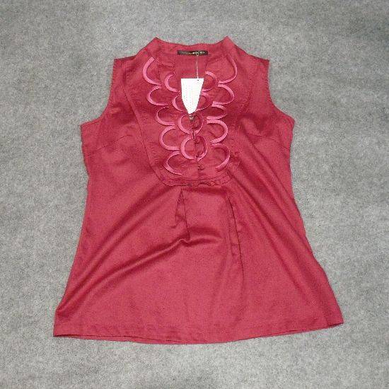 Featured is a sleeveless blouse in fashionable styling. It boasts a stand collar and a buttoned placket. The layered detailing along the V-neckline adds style to the entire piece, making it a great item to the closet of all ladies.