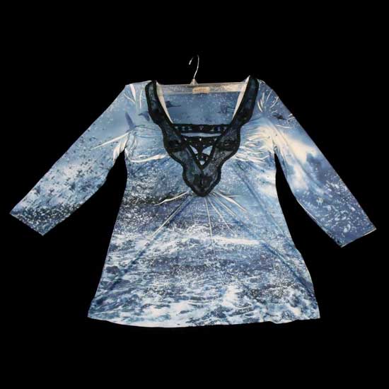 Featured here is a blouse designed for ladies to keep in their fall/winter wardrobe. The blouse is dyed in various splashes of colors for a stylish look. The laced neckline adds femininity to the whole piece.