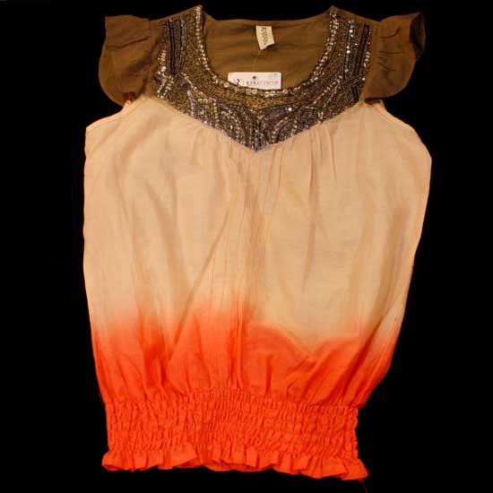 This sleeveless blouse is highlighted by the vivid colors. The pleated accents and shiny beads add style to this round-neck top. The stunning top showcases a unique and edgy style.