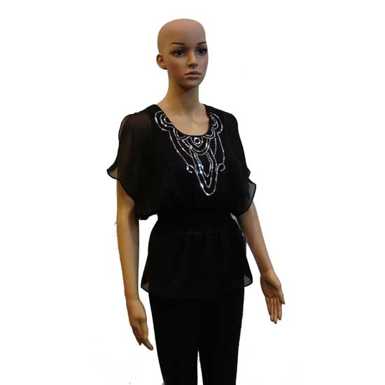 Featured is a flowy blouse with a fine polyester composition. The plain black blouse is adorned with sparkling details on the bodice. The slimming design at the waist promises a flattering fit.