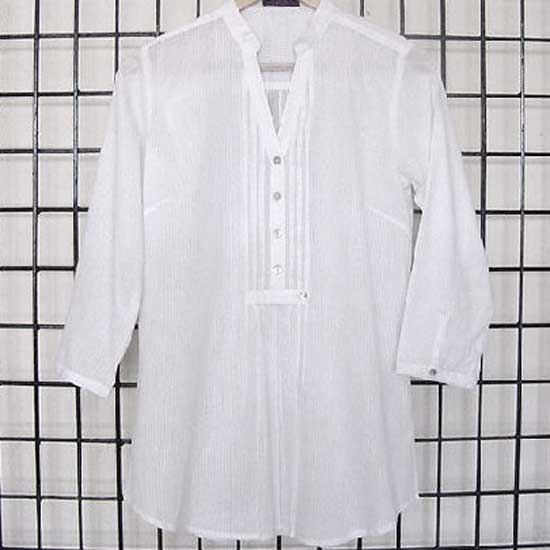 This ladies' blouse highlights a lightweight and sheer structure with long sleeves and a half button-up front style. This soft blouse features a loose fit and a classic V-neckline collar. The allover pure white hue makes this ladies' blouse an elegant addition to complete your wardrobe.