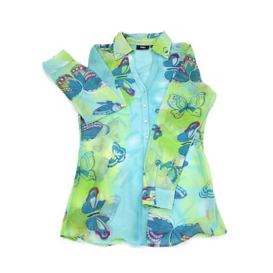 Displayed is a ladies' blouse featuring a refreshing color scheme with butterfly patterns. Made of polyester, this blouse is light and keeps your body cool. This lovely ladies' blouse goes well with jeans and slim pants.