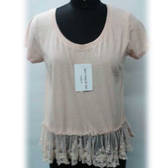 This short-sleeved ladies' blouse comes in a lovely color. With embroidered mesh around the hem, this blouse is fashionable and elegant. This blouse is made of cotton jersey for comfortable wearing.