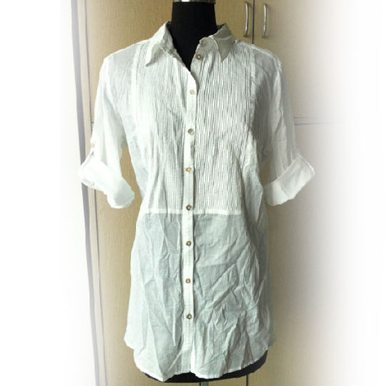 This is a ladies' blouse that comes in an elegant white color. In a long length, this button-up blouse features rolled-up sleeves for a fashionable look. This blouse is made of cotton for comfortable wearing.