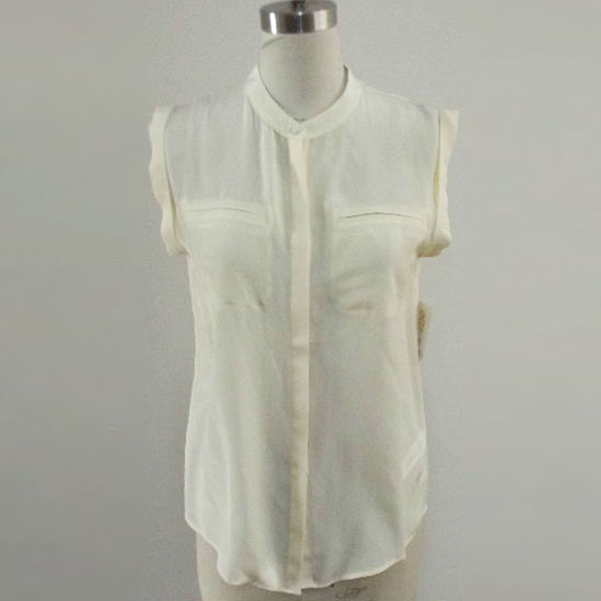This is a ladies' blouse made of silk. With a sleeveless design, this blouse features a choker neckline for an elegant look. In a neutral color, this high quality ladies' blouse is a great choice for work.