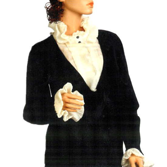 This ladies’ blouse is great for a decent look with its elegant flair. The faux two-piece design with an inner white shirt is exceptionally unique. The ruffle neckline and cuffs are truly feminine.