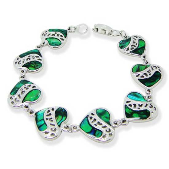 This beautiful bracelet features heart-shape adornments to please ladies’ eyes. The delicate hearts are embedded with genuine paua shell, which are polished with a nice luster. Matched the shiny settings, this bracelet makes a sleek item for mix and match.