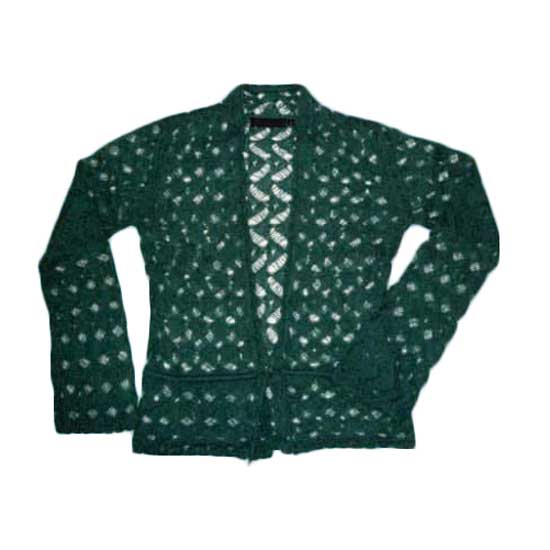 Showcased is a green cardigan with allover abstract prints. The open front comes with two big pockets to hide your mitts. The