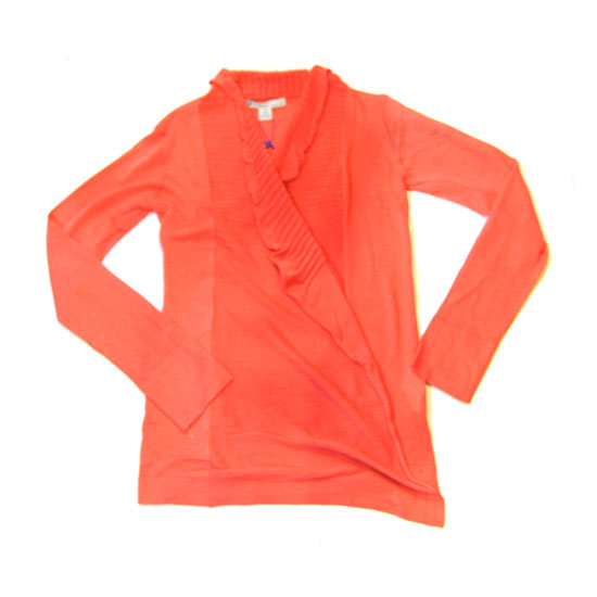 Showcased is a long-sleeve cardigan coming with an open front. The placket features wavy ruffles and ribs. The cardigan is sharp orange in color, making it perfect for brightening up casual looks.