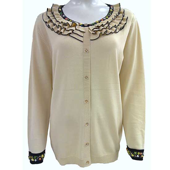 This ladies’ cardigan comes in off-white color that gives a sense of peacefulness. The clean cardigan boasts a vivid-colored bead-accented scoop neck surrounded by tiers of ruffles to bring out feminine grace. The captivating cardigan is finished with golden button closure, which makes perfect harmony with the entire appearance.