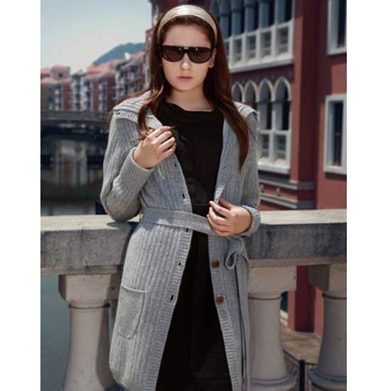 This light gray ladies' cardigan features a spread collar and a buttoned front. The waist belt is perfect to show the wearer's flattering silhouette. The two top-entry pockets add functionality to the cardigan.