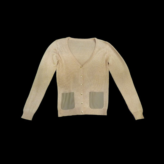 This is a ladies' cardigan featuring a V-shaped neckline and a button front closure with golden buttons. Two gray pockets add a touch of uniqueness to this design. This cardigan surely is a great choice for chic ladies.