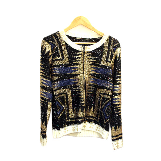 This ladies' cardigan comes with a trendy and eye-catching appearance. It comes in black with metallic golden and blue patterns. The shimmering sequins make this cardigan look more charming.