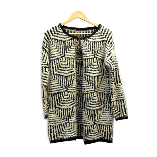 This is a ladies' cardigan with eye-catching white and black patterns. It comes in long style with an open front closure. This cardigan is made of quality acrylic material with excellent workmanship.