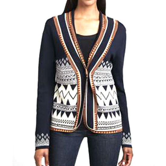 This is a ladies’ cardigan sweater that is made of top-quality material for a natural texture. The allover jacquard patterns add a touch of style to the whole piece. This cardigan sweater is finished with a long opening front and long sleeves.