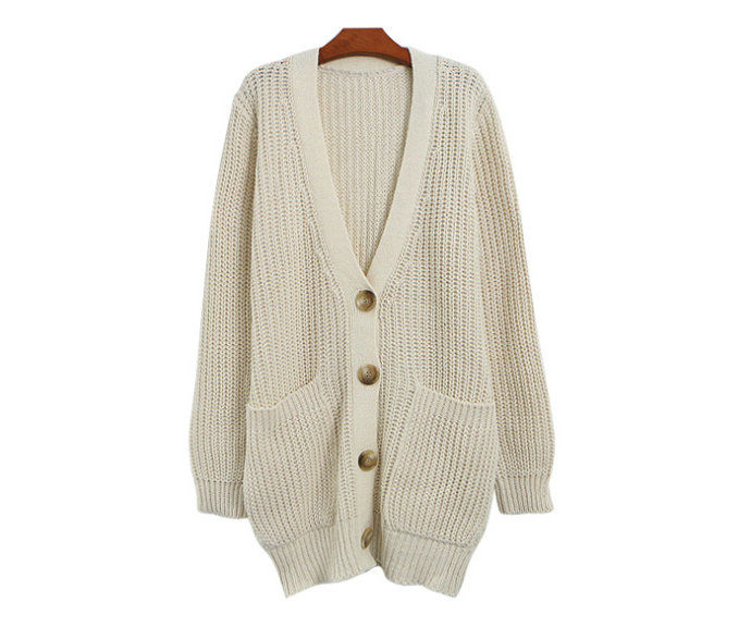 A simply-designed cardigan in a plain and light hue, this outer piece pairs well with various clothing items and styles seamlessly. Cut in a relaxed silhouette for snug wearing, it comes completed with elegant V-neckline, ribbed details and button-up closure. Two large side pockets add functions to this outer piece, which keeps your hands warm and your essentials easy to access.