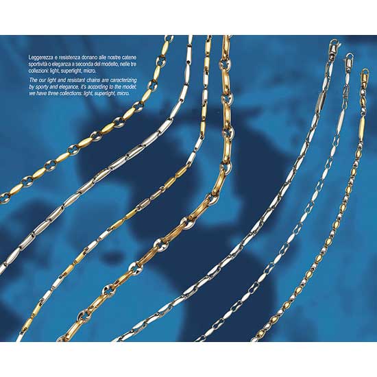 The stylish ladies' chains feature different designs. They come with various interlocking links in pear, hoop and ribbon shapes. All chains go with polished silvery and golden complexions. They also come with lobster clasps.