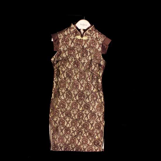 Showcased is a ladies’ traditional cheongsam combining with modern western elements. Golden lace fabric is used to fill the design with an elegant style. Silky sleeves are added to concert with the delicate lace patterns.