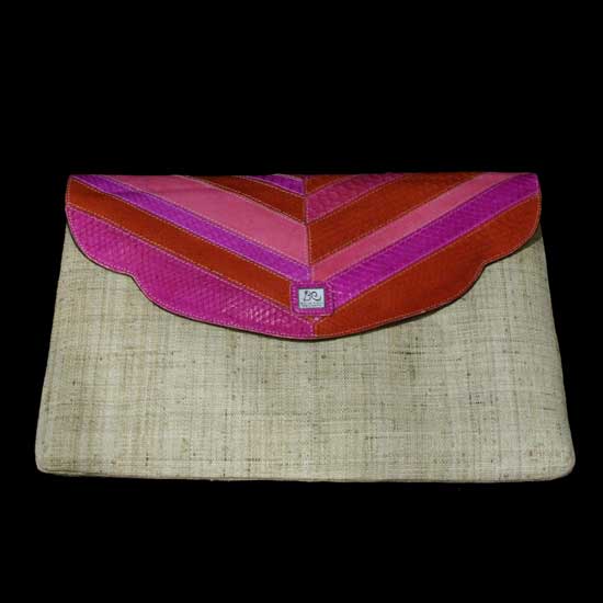 This trendy clutch showcases a lovely envelop design. It is accented with a brightly colored flap-over closure. Woven from natural fiber, the clutch boasts durable yet lightweight construction.