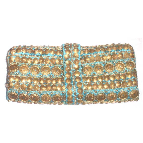 This stunning clutch bag dazzles you with the glistening all-over brass embellishments and the alluring turquoise color. Made of high-quality polyester fabric, the clutch has a distinctive soft texture that makes it stand out impressively from the rest. Featuring a classic rectangular shape and a lustrous sheen, this exquisite clutch is an excellent choice wherever sophistication and refinement are called for.