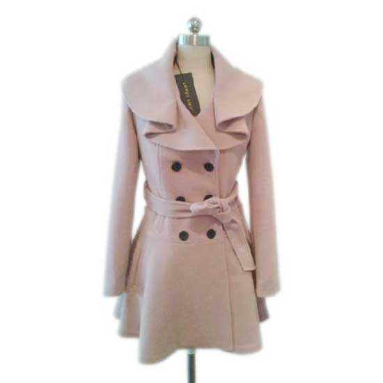 This pink ladies' coat features a unique collar and a double-breasted front closure with six contrasting buttons. It comes with a removable strap belt to accentuate the wearer's figure. Exquisite and elegant, this fashionable coat surely is a smart choice in the cold winter for chic ladies.
