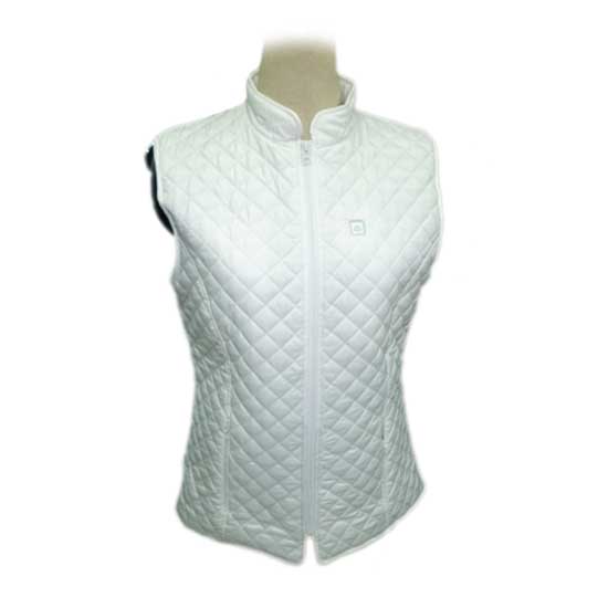 This pure-white ladies' coat features a padded design for added warmth and comfort. This sleeveless coat is designed with a classic stand collar and a zippered closure front. It is an ideal addition to mix and match with your skin-tight top wear.