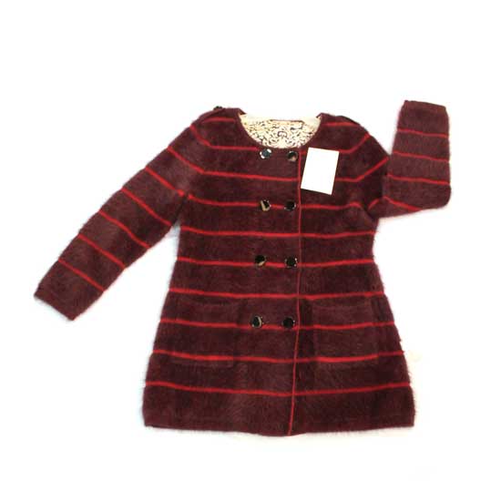 This is a ladies' coat that is finely made of extremely soft and comfortable material. It is designed with a classic round neckline, long sleeves and a double-breasted button front. The allover striped patterns add extra style to the whole look.