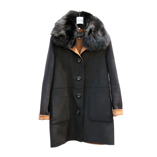 This stylish ladies’ coat is designed in timeless black. It features long sleeves, two side pockets, a button-up closure and a fur collar. This fashionable coat is made of 90% wool and 10% nylon to ensure wearing comfort and warmth.