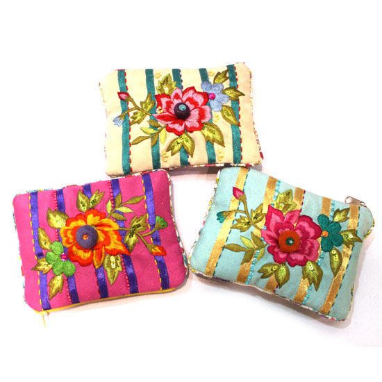 The picture displays three colorful purses embroidered with showy floral patterns. The purses are painstakingly crafted with top-quality fabric with rich and vibrant colors. These compact purses are suitable for storing coins, cards and receipts.