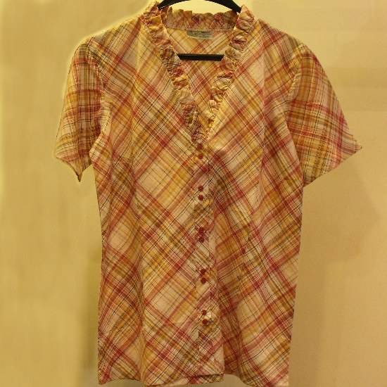 Featured is a short-sleeve blouse in a stylish design. It boasts a ruffled V-neckline with a buttoned placket. The all-over grid pattern gives out a lively feeling, making it a great addition to the summer closet.