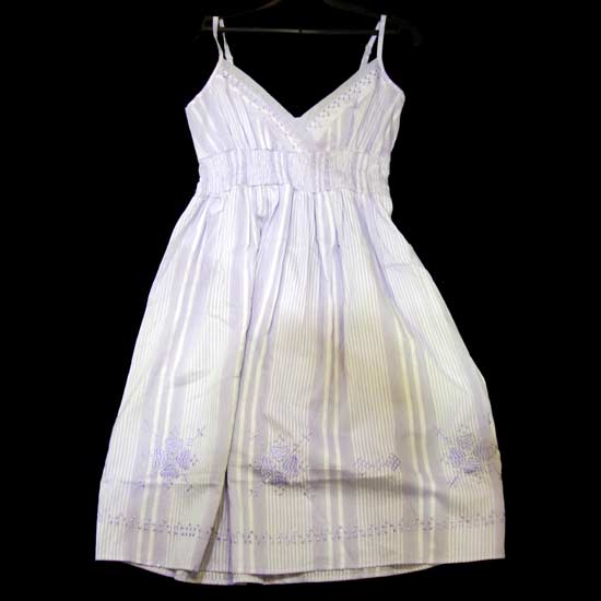 This elegant dress features a pair of spaghetti straps. It highlights fancy vertical stripes and embroidered floral patterns. The ruffled front gives this dress an elegant touch.