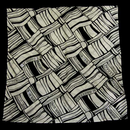 The ladies' scarf is covered with black and white geometric prints, showcasing a retro look. It is embellished with glass beads for added style. This square printed scarf will bring style to your look.