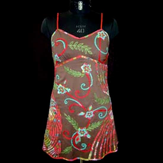 The printed short dress boasts hand applique embellishments to showcase artistic elegance. It comes with spaghetti straps and a heart-shape bodice for a flirtatious look. This casual printed dress makes a perfect choice for summer days.