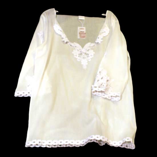 The ladies' mid-sleeve blouse features an elegant construction with floral crochet trimmings. The loose-fitting design adds a casual and flowing touch. This simple crochet blouse is great for everyday wear.