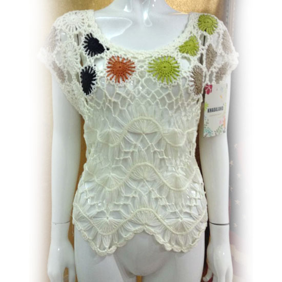 This is an knitted crochet tunic accented with colored details on the chest and shoulders. The wavy hem adds a lovely touch to the tunic. This tunic matches easily with tanks and camisoles and can be worn as beachwear to keep your curves modest and minimalistic.