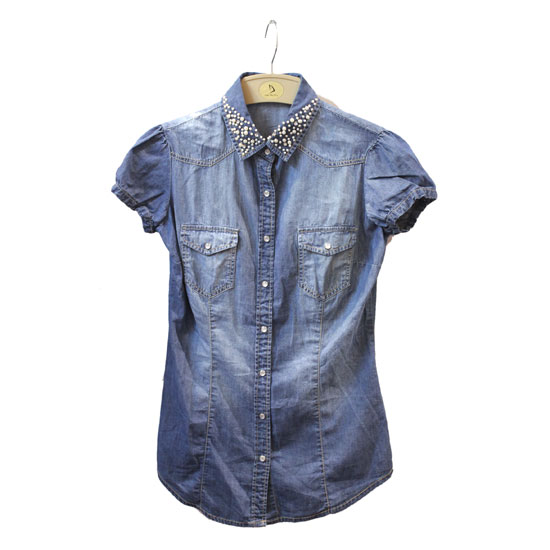This ladies’ denim blouse features a regular spread collar with embellishments and cap sleeves. The front is designed with two breast pockets for added functionality. The stylish blouse is finished with a button closure.