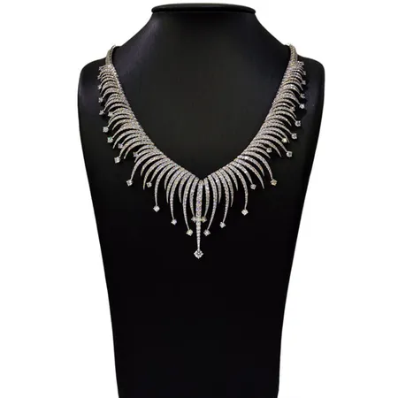 The admirable ladies' necklace flaunts an elegant fringe design meticulously crafted with 18K white gold. The top-quality diamond offers a glittering touch to the item. This diamond necklace is an excellent choice for the grand occasions.